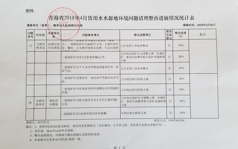 称多县2018年4月饮用水水源地环境问题清理整治进展情况统计表