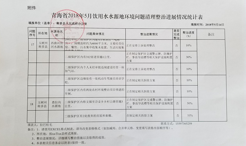 称多县2018年5月饮用水水源地环境问题清理整治进展情况统计表