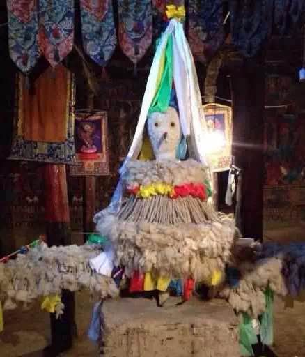 卓木齐村经堂里供奉着一只传说中的神鸟。相传该神鸟是嘎朵觉悟神山的管家,它的颈项上挂着一串钥匙,据说是开启尕朵觉卧神山财富、智慧、健康、福寿宝库的钥匙,祭祀神鸟是糌粑节的一部分。