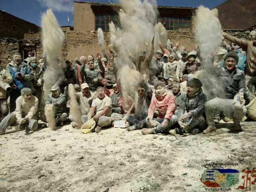 与此同时,快乐的“糌粑大战”便拉开了帷幕。这时,现场所有人可以毫无禁忌,一起相互追逐、抛撒糌粑、见谁撒谁,热恋中的男女青年也可以向自己的心上人抛撒糌粑,在一起狂欢。不一会儿功夫,整个村落及所有在场的人们,无一人会遗漏掉,所有人的脸上、身上已经是粉白一片……