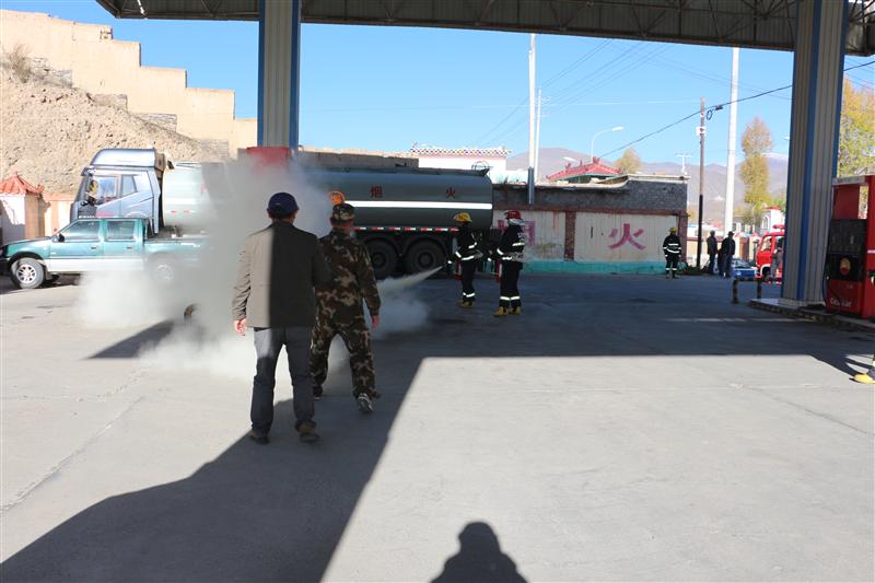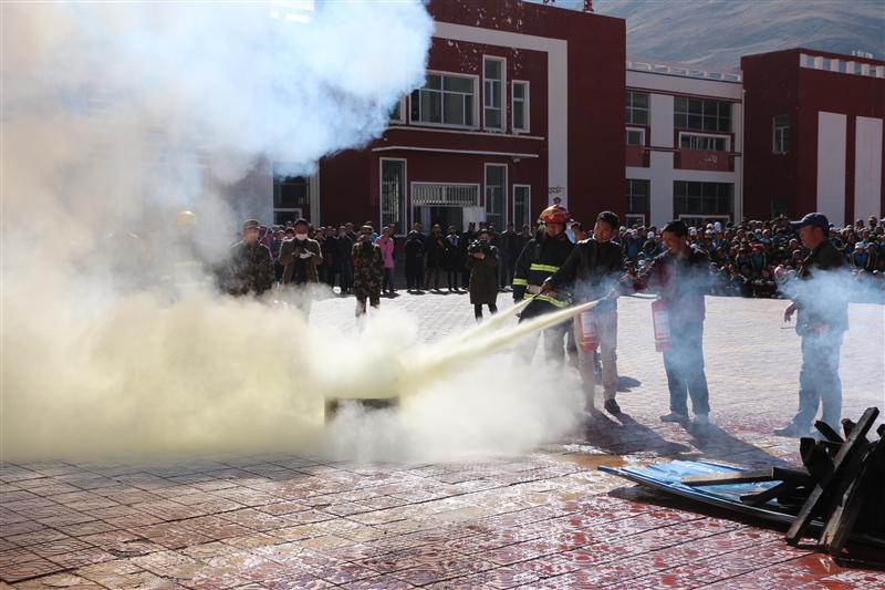 本次演练分为三部分,首先在称多县民族中学和称多县第三高级中学开展应急疏散演练及消防安全宣传活动,为在校师生讲解消防安全知识、初期火灾扑救、干粉灭火器的使用、疏散逃生方法及日常生活消防安全知识等,并作了现场演示。活动中,警报声响起,参演各单位工作人员在学校老师的配合下,迅速组织学生捂住口鼻、低下身子,按照事前设定的安全逃生路线,迅速有序地撤出教学楼,到达指定安全地带。演练结束后,为学校赠送了消防知识教材及手提式干粉灭火器。其次,是加油站疏散灭火演练。演练假设10时15分新世纪加油站3号加油机起火,事故发生后,加油站迅速组织工作人员进行火灾初期控制,引导人员疏散。10时25分左右,县安监局、消防大队官兵、公安、气象等单位人员先后到场,在了解现场情况后,指挥员将救援力量分为4个小组:救援组负责侦查火情,对火势发展进行实时汇报;灭火组出一只泡沫枪对加油机火势进行泡沫覆盖;救援组对受伤人员进行救助;警戒组对加油站周边进行警戒。经过30分钟的救援最终将“大火”扑灭。最后,是广场疏散演练。演练开始后首先由县安监局、消防中队各一名业务精炼的骨干开始讲解授课,为在场所有人员讲解了引起火灾的常见原因,包括:电器火灾、用火不慎、遗留火种、违反安全操作规程等,从而提高大家对安全隐患的警惕性;接着,为群众发放了安全宣传资料,讲解火场逃生技巧以及干粉灭火器的使用方法。最后,组织现场人员开展一次模拟火灾疏散演练,当听到警报信号后,群众按照讲解的火场逃生技巧,紧张有序的疏散,安全危险也迅速被消防官兵们及时排除,整个演练效果非常好。